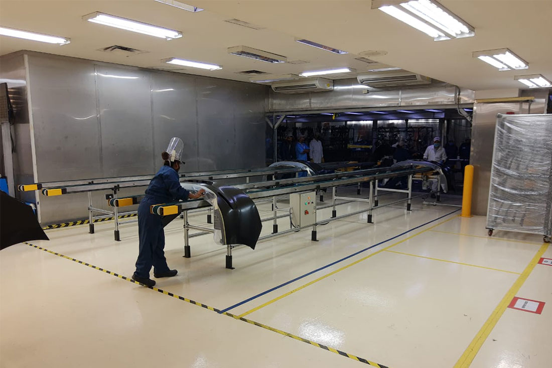 Este transportador está diseñado para trasladar las defensas plásticas del área de ensamble de la empresa al área de pintura.